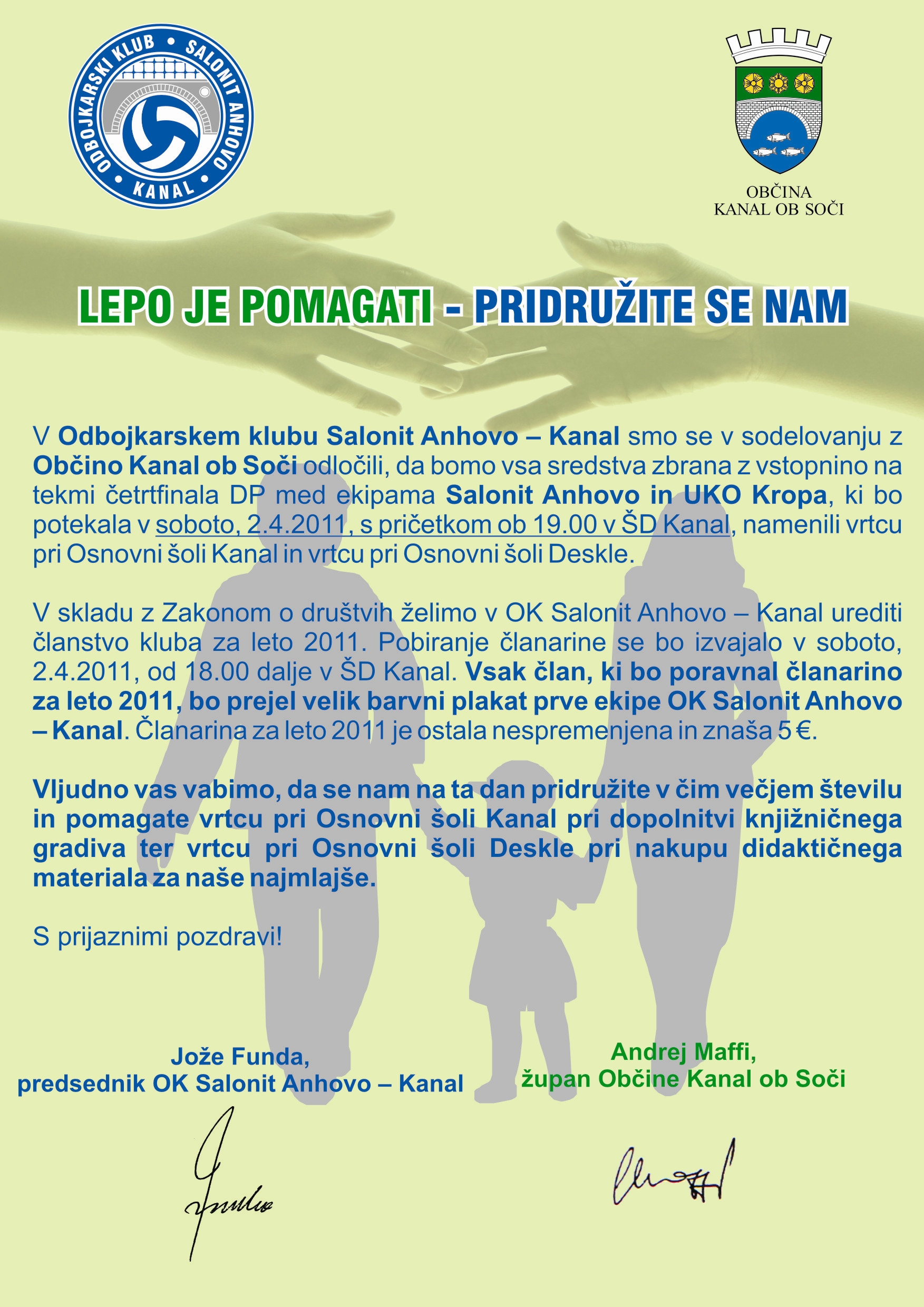 V Odbojkarskem klubu Salonit Anhovo - Kanal so se v sodelovanju z Občino Kanal ob Soči odločili, da bodo sredstva zbrana z vstopnino na tekmi četrtfinala DP med ekipama Salonit Anhovo in UKO Kropa, ki bo potekala v soboto, 2. 4. 2011 s pričetkom ob 19. 00 v ŠD Kanal, namenili Vrtcema Kanal in Deskle.