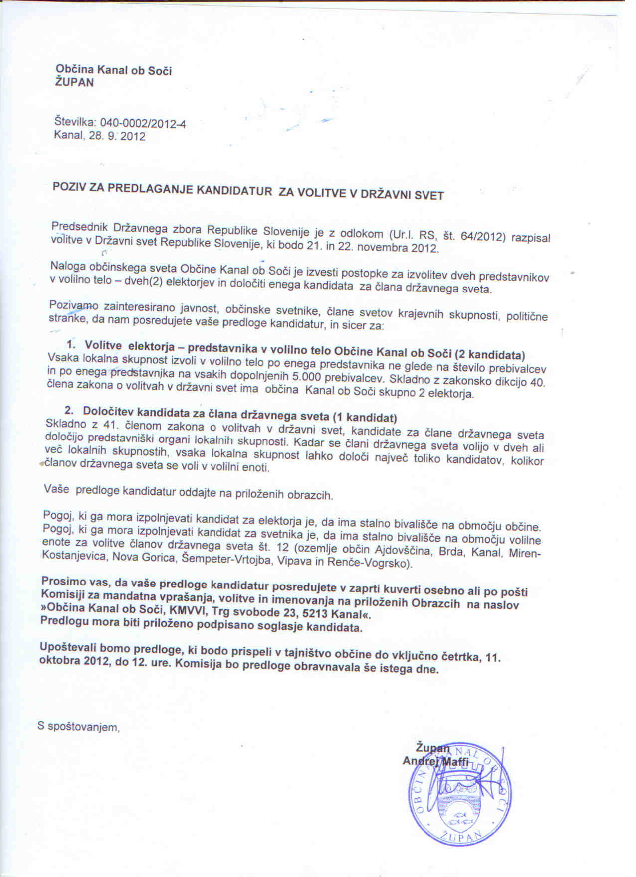 Naloga občinskega sveta Občine Kanal ob Soči je izvesti postopke za izvolitev dveh predstavnikov v volilno telo – dveh(2) elektorjev in določiti enega kandidata za člana državnega sveta.