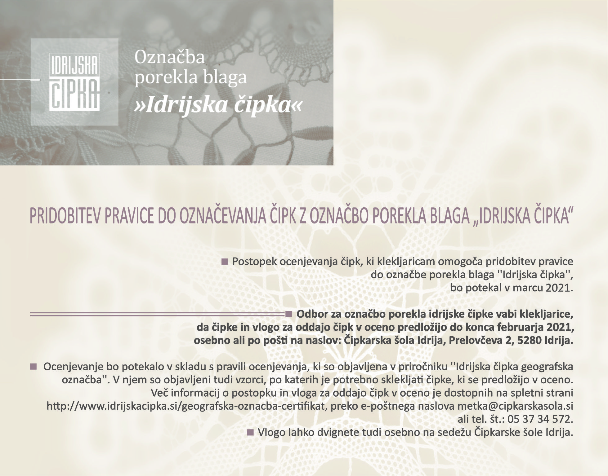 PRIOBITEV PRAVICE DO OZNAČEVANJA ČIPK Z OZNAČBO POREKLA BLAGA »IDRIJSKA ČIPKA«