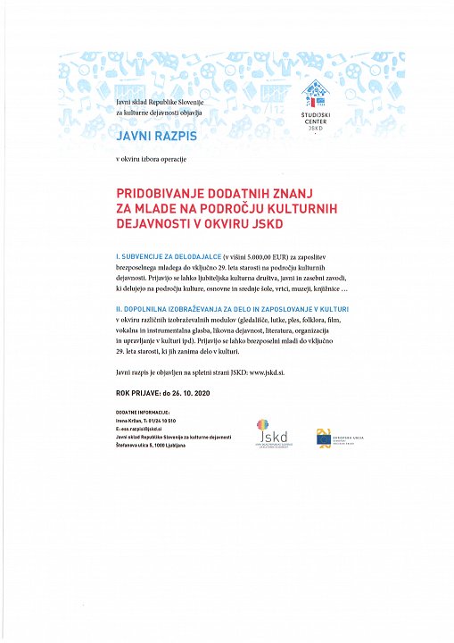 ŠTUDIJSKI CENTER JSKD objavlja JAVNI RAZPIS